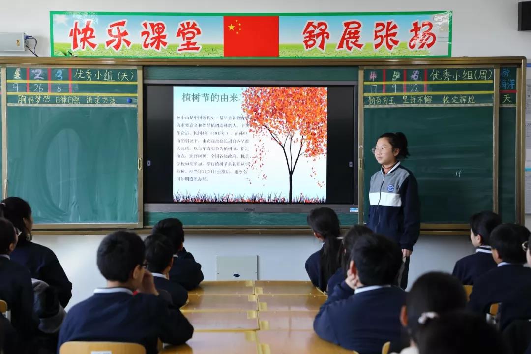 种植一份希望,梦想一片未来。以班级为单位,每班的学生把写有寄语的心愿卡系在了自己栽种的松树上。从学生微笑的脸庞上,我们能感受到他们满满的喜悦和成就感。